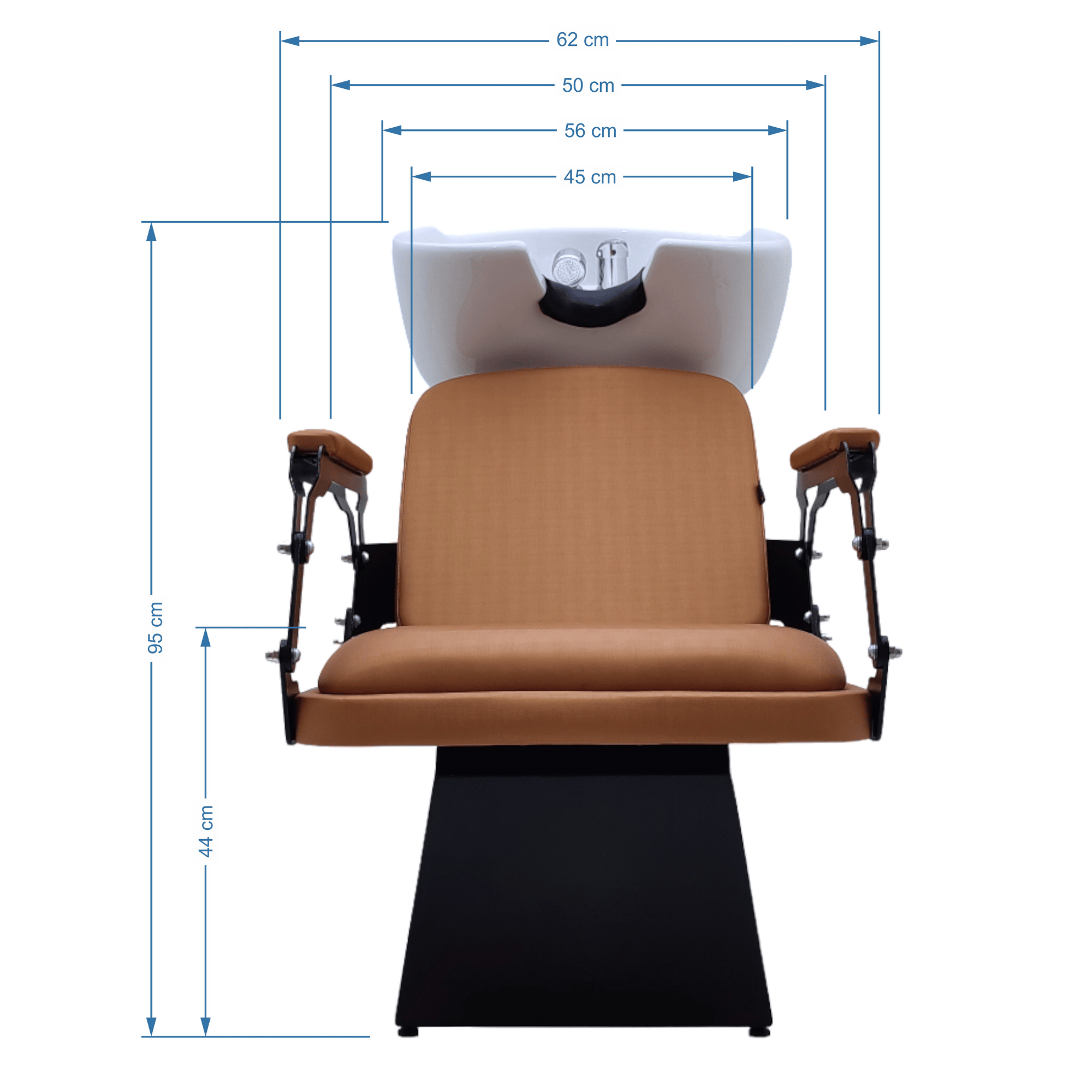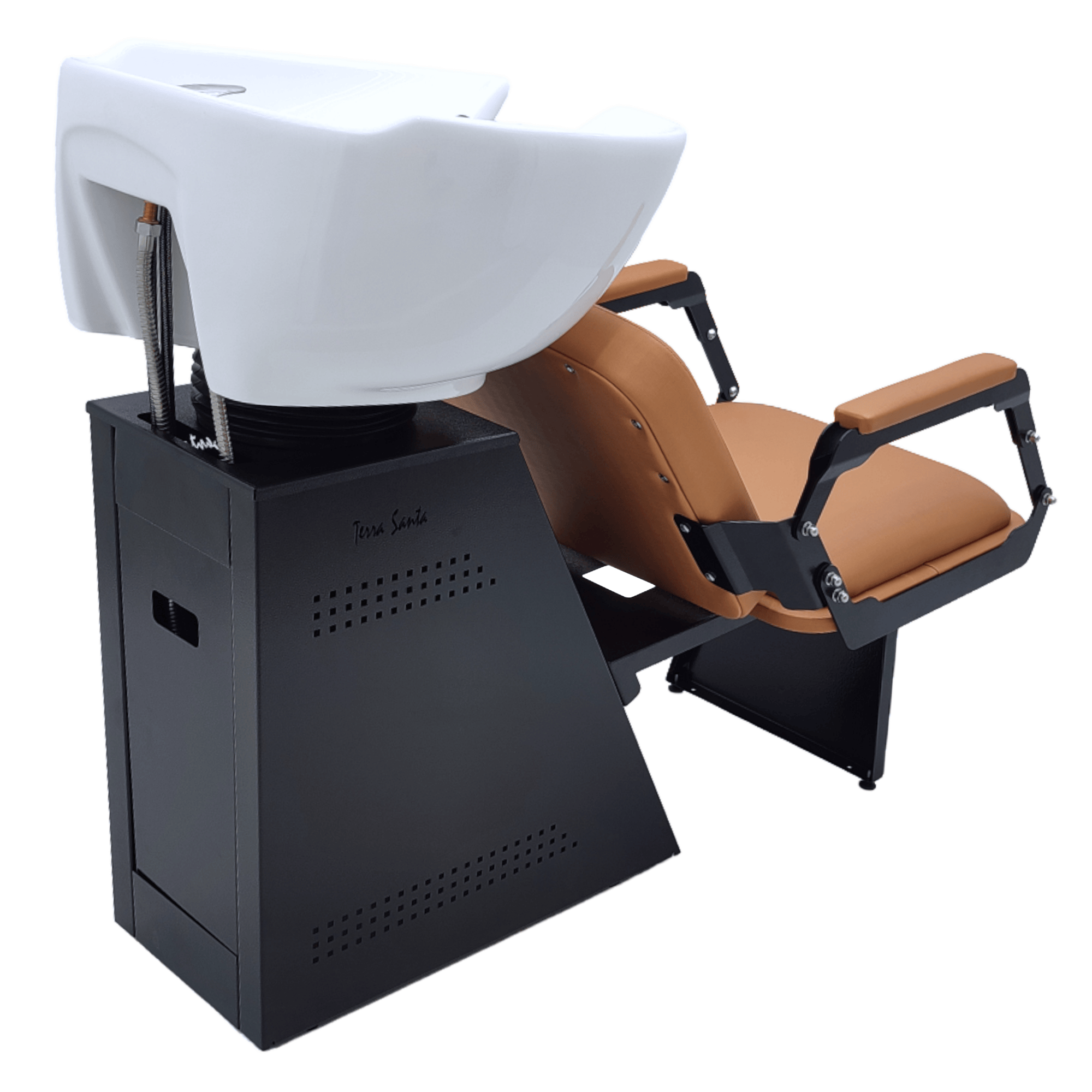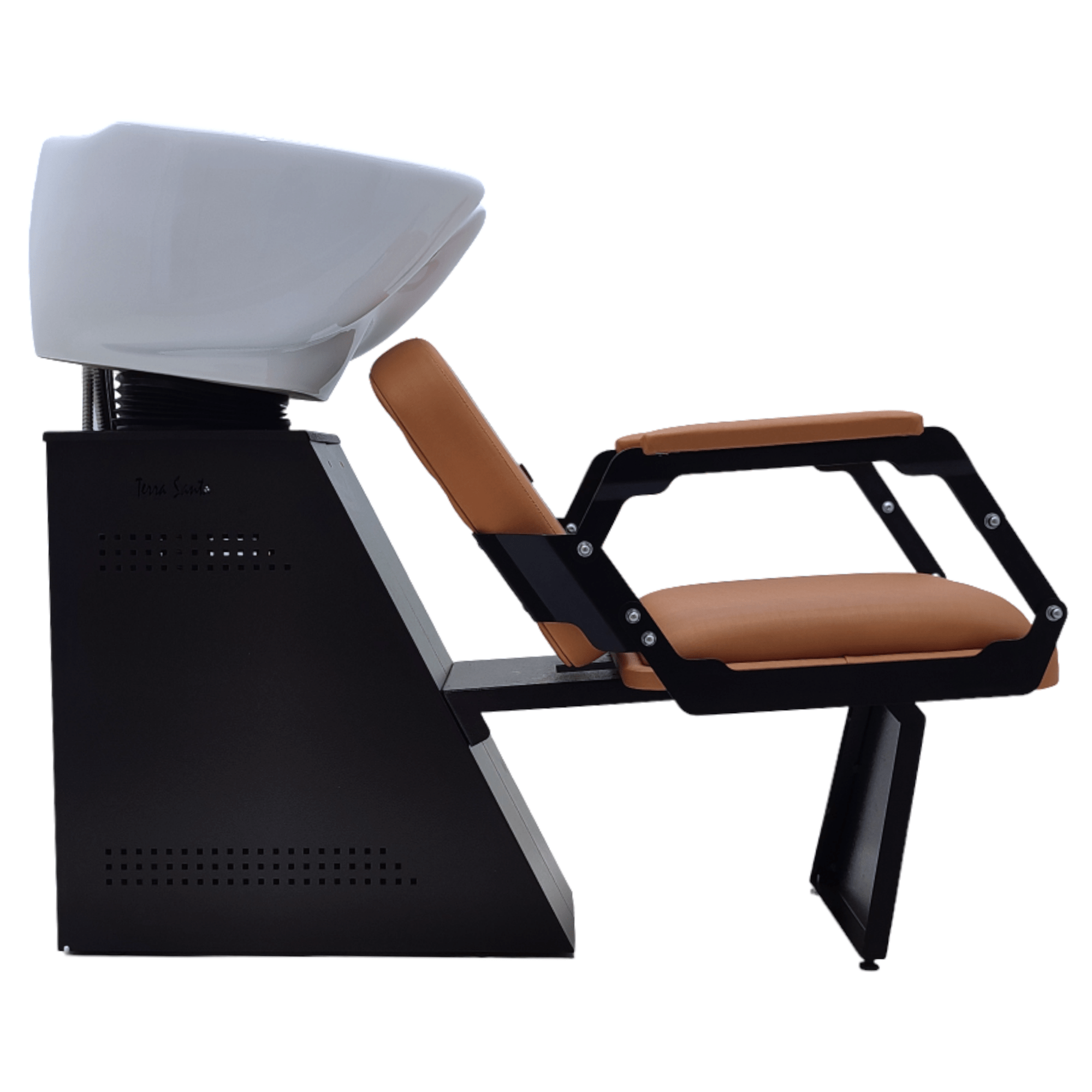 Lavatório King para Barbearia, assento e encosto em espuma D33, com revestimento em curvim, braços em aço cortados a laser com acabamento pintado, cuba em porcelana.
